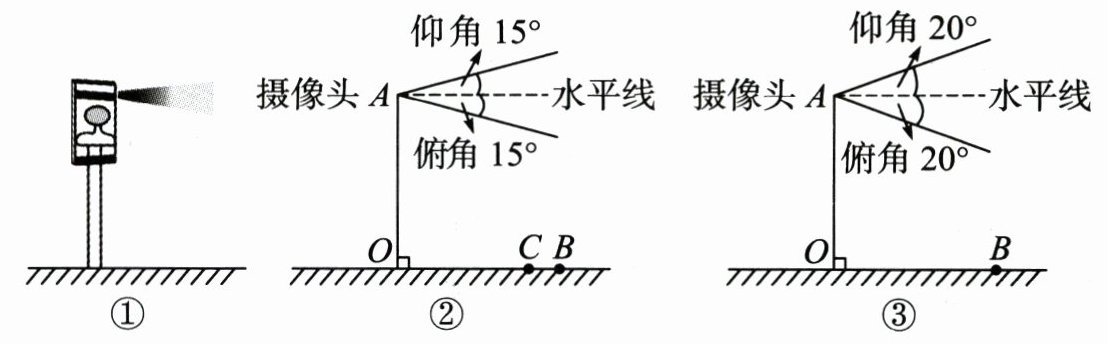 (2)身高120 cm 的小若,头部高度为15 cm,踮起脚尖可以增高3 cm,但仍无法被识别,社区及时将摄像头的仰角、俯角都调整为20°(如图③),此时小若能被识别吗? 请计算说明.(参考数据:sin15°≈0.26,cos15°≈0.97,tan15°≈0.27,sin20°≈0.34,cos20°≈0.94,tan20°≈0.36)