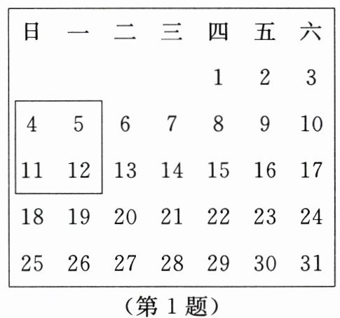 1. 如图,在日历表上可以用一个方框圈出4个数.若圈出的4个数中,最小数与最大数的乘积为65,请用方程知识求这个最小数.