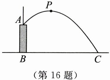 16. 如图,人工喷泉有一个竖直的喷水枪 AB,喷水口 A 距地面 2 m,喷出水流的运动路线是抛物线.若水流的最高点 P 到喷水枪 AB 所在直线的距离为 2 m,且到地面的距离为 3 m,则水流的落地点 C 到水枪底部 B 的距离为