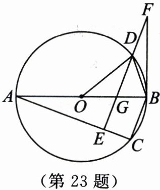 23. (本小题 12 分)如图,△ABC 内接于⊙O,AB 是⊙O 的直径,$\widehat{BC}= \widehat{BD}$,DE⊥AC 于点 E,直线 DE 交 BF 于点 F,交 AB 于点 G,∠BOD= 2∠F,连接 BD.