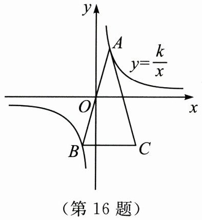 16. 如图,在平面直角坐标系中,等腰三角形 ABC 的腰 AB 经过原点,底边 BC 与 x 轴平行,反比例函数$y= \frac{k}{x}$的图象经过 A,B 两点.若点 A 的坐标为$(1,4)$,则点 C 的坐标为
