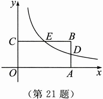 21. (本小题 8 分)如图,在平面直角坐标系中,四边形 OABC 是矩形,反比例函数$y= \frac{k}{x}(x>0)$的图象分别与 AB,BC 交于点 D(4,1)和点 E,且 D 为 AB 的中点.
