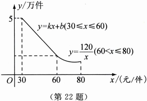 22. (本小题10分)某工艺品厂生产一种汽车装饰品,每件生产成本为20元,销售价格为30~80元/件(含30元/件和80元/件),销售过程中的管理、仓储、运输等各种费用(不含生产成本)总计50万元,其销售量y(单位:万件)与销售价格x(单位:元/件)的函数关系如图.