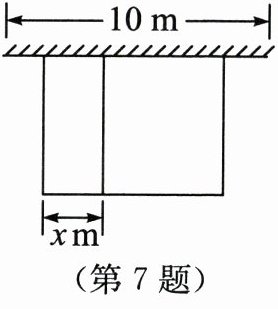 7. 某农场计划建造一个矩形养殖场,为充分利用现有资源,该矩形养殖场一面靠墙(墙的长度为10 m),另外三面用栅栏围成,中间再用栅栏把它分成两个面积比为1:2的矩形.如图,已知栅栏的总长为24 m,设较小矩形的宽为x m.当x为多少时,矩形养殖场的总面积最大?最大值为多少?
