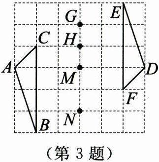 3. 如图,在网格中,每个小正方形的边长均为 1.已知 A,B,C,D,E,F,G,H,M,N 均是网格线的交点,$\triangle ABC$ 与 $\triangle DEF$ 关于某点对称,则其对称中心是 (