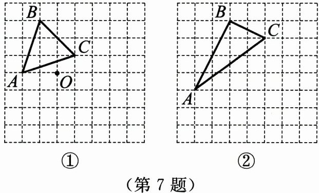 (1) 在图①中,作 $\triangle ABC$ 关于点 O 对称的 $\triangle A'B'C'$;