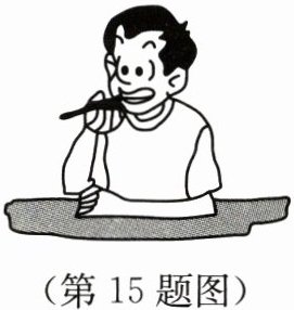 15. 如图所示,用牙轻轻咬住铅笔上端,用手指轻敲铅笔下端,注意听这个敲击声.然后张开嘴使牙不接触铅笔,而保持铅笔位置不变,手指用与前面同样的力轻敲铅笔下端.这时也听到了声音.