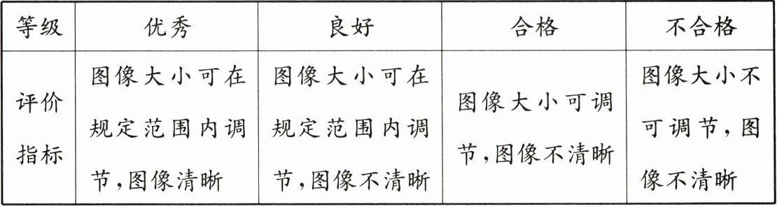 |评价指标|图像大小可在规定范围内调节,图像清晰|图像大小可在规定范围内调节,图像不清晰|图像大小可调节,图像不清晰|图像大小不可调节,图像不清晰|