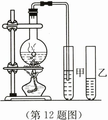 12. 如图所示,在两个相同的试管甲和乙中分别装入质量和初温相同的水,然后将沸腾时产生的水蒸气直接通入试管甲的水中,水蒸气在甲中几乎全部液化,待甲中的水面上升一段高度后,停止通入水蒸气,测出此时甲中水的温度为t.以下能验证水蒸气液化放热的操作是 (