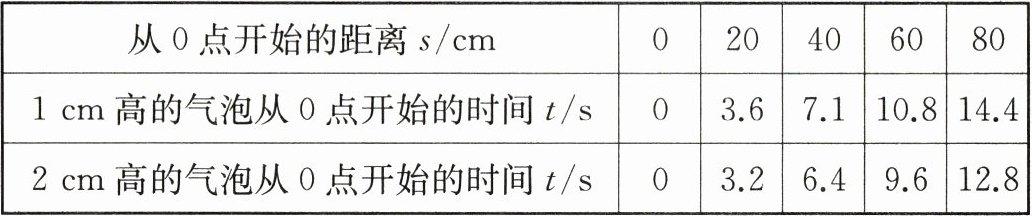 |1 cm高的气泡从0点开始的时间t/s|0|3.6|7.1|10.8|14.4|