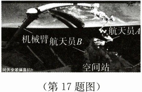 17. 2024年5月28日,“神舟十八号”乘组航天员圆满完成出舱任务.如图所示,搭乘机械臂的航天员A已为空间站安装好空间碎片防护装置,航天员B正在出舱.以空间站为参照物,安装好的防护装置是