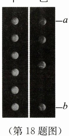 18. “频闪摄影”是研究物体运动时常用的一种实验技术.摄影在暗室中进行,快门是常开的,但是由于没有光照亮物体,底片并不感光.光源是一只闪光灯,它每隔一定时间闪亮一次,物体就被照亮,底片就记录下这时物体的位置.光源不断闪亮,底片就记录下物体每间隔相同时间的不同位置.两个质量相同的甲、乙小球,均从位置a竖直下落到位置b,其各自的频闪照片如图所示,试根据照片分析: