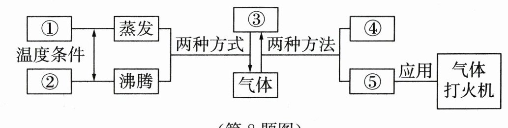 8. 如图所示是小明学完"汽化和液化"后梳理的思维导图.图中①~⑤处填写正确的是(