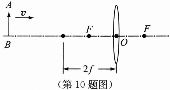10. 如图所示,凸透镜的光心为O,焦点为F.物体AB从距凸透镜2倍焦距外向2倍焦距处移动的过程中,若以AB为参照物,则像的运动方向为(