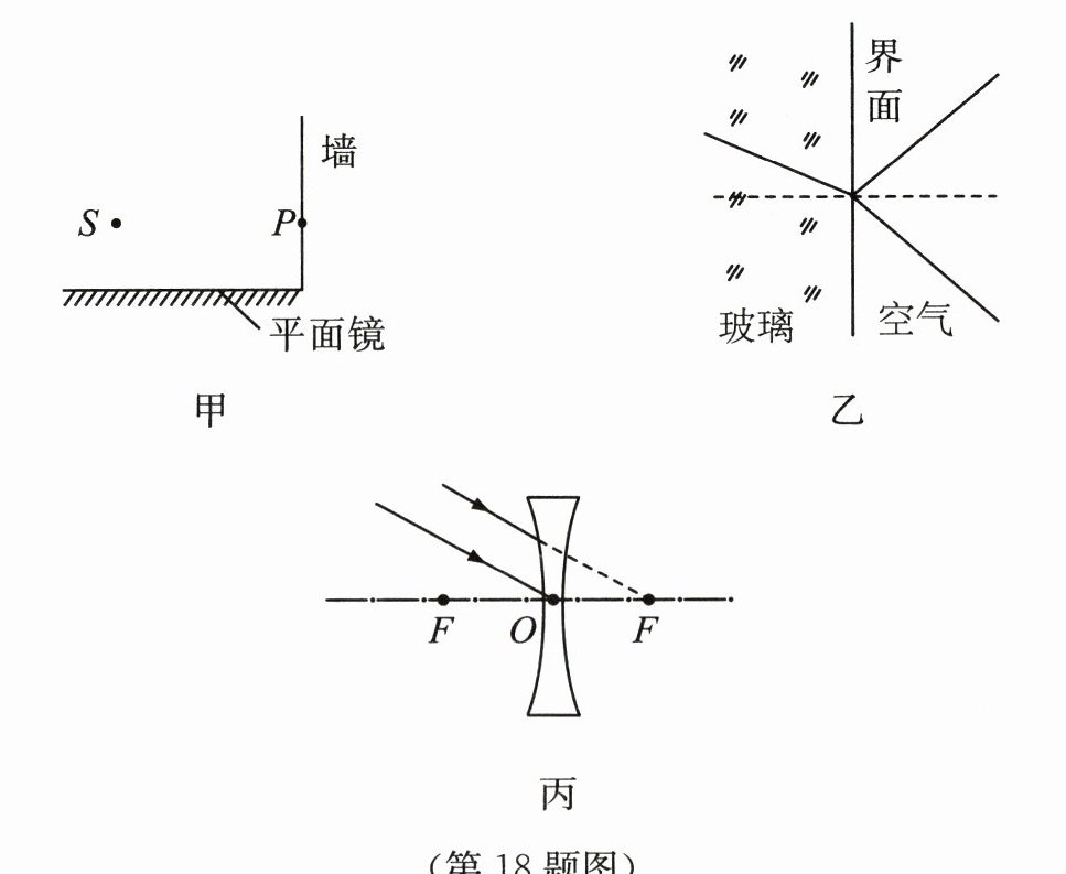 18. (6分)(1) 如图甲所示,从点光源S发出的一条光线射向平面镜,经平面镜反射后射到墙上的点P处.请你作出这条入射光线并完成光路图.