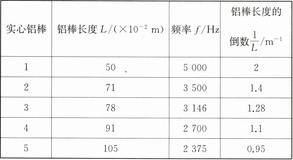 |实心铝棒|铝棒长度$L/(×10⁻^2m)$|频率f/Hz|铝棒长度的倒数$1/L/m⁻^1$|