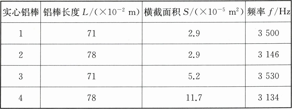 |实心铝棒|铝棒长度$L/(×10⁻^2m)$|横截面积$S/(×10⁻^5m^2)$|频率f/Hz|