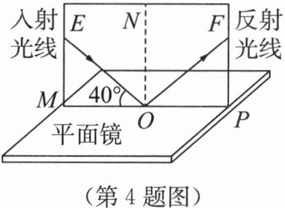 4. 小鸿同学在家里用一个平面镜和一张可沿ON折叠的硬白纸板ENF来探究光的反射规律.探究过程中,平面镜放在水平桌面上,ENF竖直立在平面镜上.通过测量他发现此时入射光线与平面镜成40°夹角,如图所示.下列说法正确的是 (