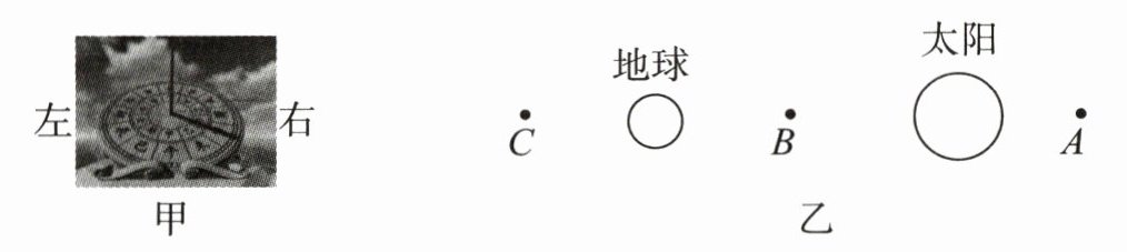 (选填"左"或"右")侧是东方.(2) 在模拟日、月食现象中,老师画出如图乙所示的示意图.若在地球上观察到月食,此时月亮可能在