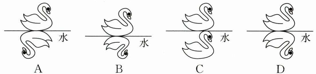 6. 小华同学周末在乡间散步,岸边不远处一只天鹅正在湖中浮游,湖水中呈现出天鹅清晰的倒影。以下四幅图中,符合小华看到的天鹅和水中倒影的情景的是(