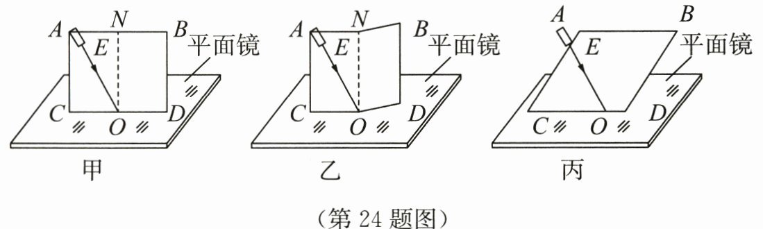 (4)在图甲中,若将纸板(连同激光笔)绕CD向后倾斜,入射光线仍能呈现在纸板上,且仍紧贴EO入射到平面镜的O点,如图丙所示,此时与图甲对比,确定没有发生改变的是