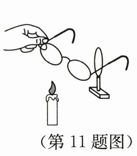 11. 如图所示,把眼镜片放在烛焰与凸透镜之间,调节光屏得到烛焰清晰的像,撤去眼镜片,像变得模糊,使光屏适当远离凸透镜,光屏上重新得到清晰的像.该眼镜片(