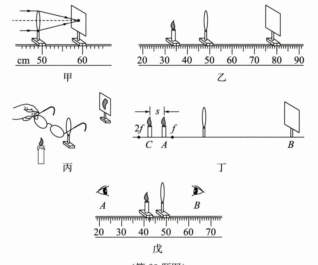 (选填“>”“=”或“<”)s.(6)如图戊所示,保持透镜位置不变,蜡烛移动至“42 cm”刻度线处,则人眼在图中