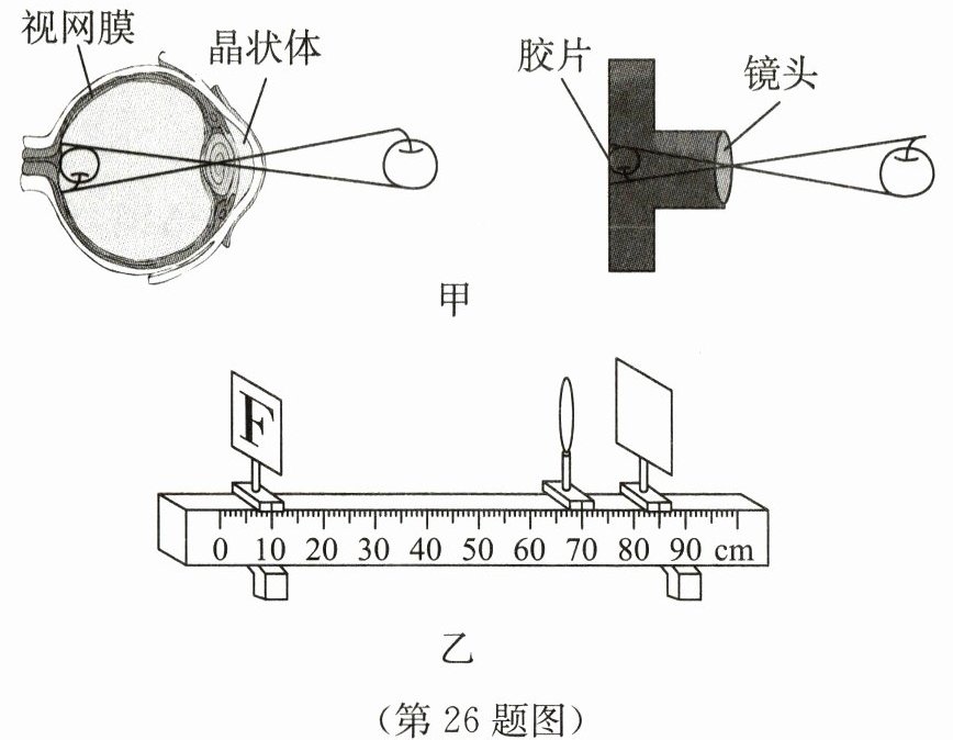 26.(10分)如图甲所示,人眼的功能类似于照相机.学习了凸透镜成像规律后,小明对人眼和照相机如何成清晰的像进行了进一步的研究:
