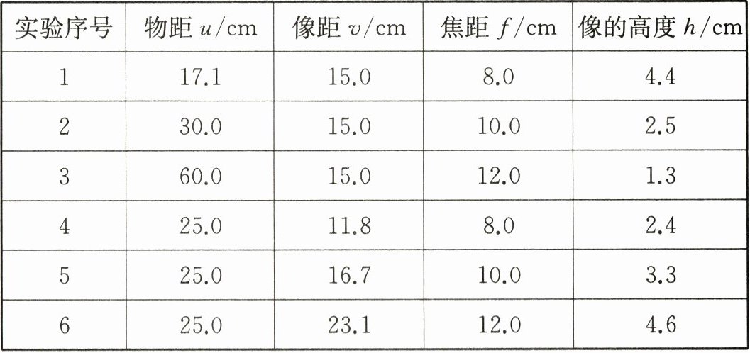 |实验序号|物距u/cm|像距v/cm|焦距f/cm|像的高度h/cm|