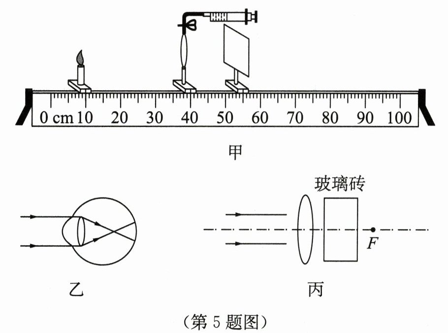 5. 小明用弹性膜注水制作了一个水凸透镜,通过注射器注水或抽水改变透镜的厚度.固定透镜,将一个蜡烛放在合适位置后,调节光屏得到清晰的像.下列说法正确的是 (