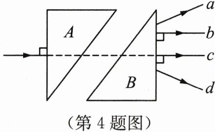 4. 如图所示,两块完全相同的直角三角形玻璃砖A和B放置在同一水平面内,斜边平行且相距一定距离.一条光线从空气中垂直于玻璃砖A的直角边射入,从玻璃砖B的直角边射出,射出后的位置和方向可能是图中的 (