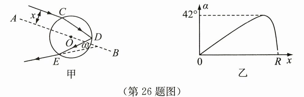 研究光线经过水珠的传播规律,可揭示彩虹形成的原因.如图甲所示,光线从点C进入半径为R的水珠,经点D反射,再从点E射出.AB是通过水珠球心O且与入射太阳光平行的直线,用x表示进入水珠的光线距AB的距离,α表示射出光线与AB的夹角,画出过入射点和球心O的直线(即该入射点的法线),进一步研究可以得出α与x的关系如图乙所示.入射的太阳光分布是均匀的,但射出的光线分布是不均匀的,在α最大时强度最大,能被地面上的人观察到.