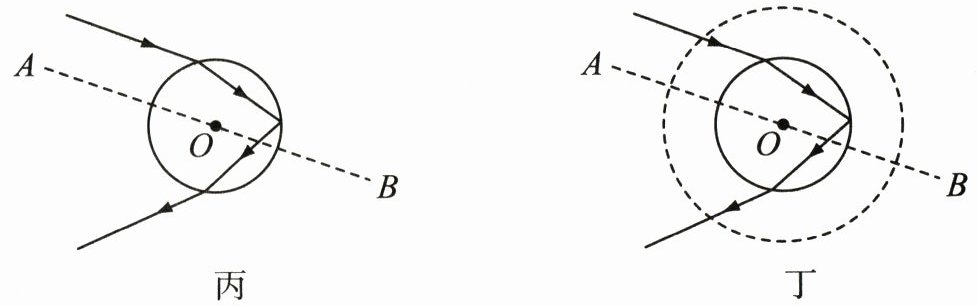 (5)图丙中画出了红光通过小水珠时α最大值的光路,请在图丁中画出红光通过大水珠(虚线圆)时α最大值的光路.(图丁中已画出小水珠中的光路)