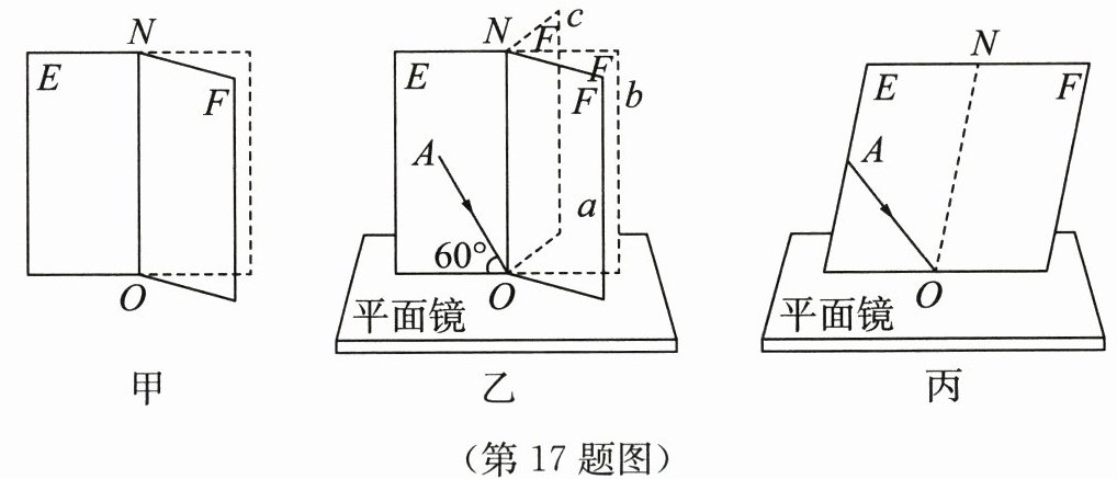 (选填"a""b"或"c"),得到"反射光线、入射光线和法线在同一平面内"的结论.(3)若保持平面镜水平不变,如图丙所示,将纸板向后倾斜一个角度,入射光线沿AO方向入射,且呈现在纸板上,此时观察到F板上的现象是