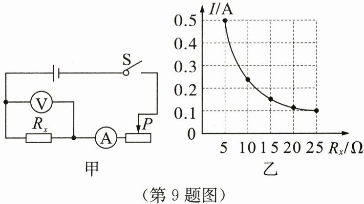 9. 某同学利用如图甲所示的电路进行实验,电源电压恒为3V,更换5个定值电阻$R_{x}$,得到如图乙所示的图像.下列有关叙述中正确的是(