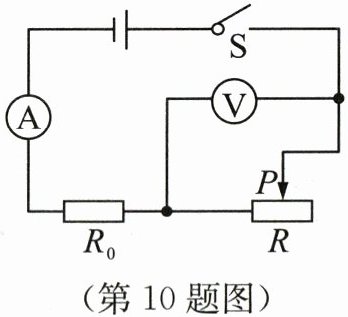 10. 如图所示,电源电压恒定,定值电阻$R_{0}$与滑动变阻器R串联,已知R的最大值大于$R_{0}$.在滑动变阻器的滑片P移动过程中,下列表示电压表示数U及电压表与$R_{0}两端电压之差\Delta U$随电流表的示数I变化的关系图像中,可能正确的是(