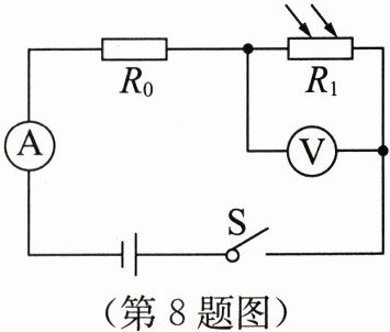 8. 如图所示电路中,$R_{0}$是定值电阻,$R_{1}$是阻值随光照强度增大而减小的光敏电阻.闭合开关S,逐渐增大光敏电阻的光照强度,下列关于两个电表示数的说法正确的是(