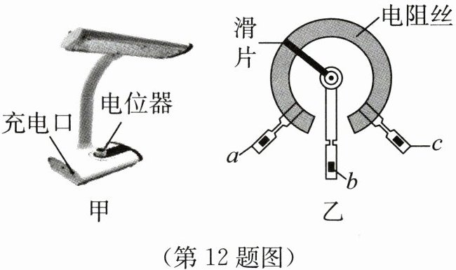 12. 如图甲所示为某可调节亮度的充电台灯,图乙为其用于调光的电位器结构图,a、b、c是它的三个接线柱,a、c分别与弧形电阻丝的两端相连,b与金属滑片相连.
