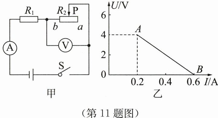 11. 如图甲所示,电源电压保持不变,$R_{1}= 10\Omega$,闭合开关S,滑动变阻器的滑片P从a端移到b端,两电表示数变化关系如图乙中线段AB所示.