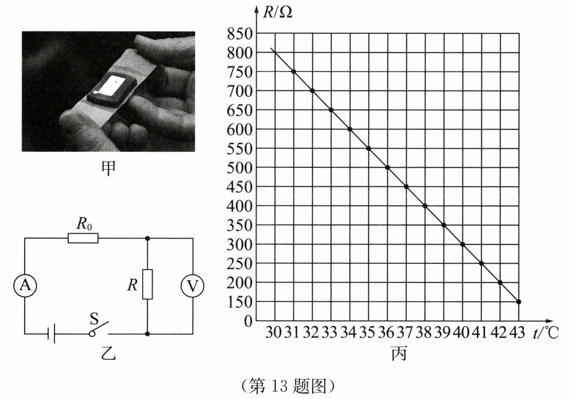 13. 如图甲所示是一种“创可贴智能体温计”,使用时将其粘贴在人体皮肤上,通过连接手机蓝牙就可以监测体温.图乙是模拟其内部电路原理图,电源电压6V不变,$R_{0}$为定值电阻,R为高精度的热敏电阻,其阻值随温度变化的图像如图丙所示,数字式电流表和电压表的量程分别为0~12mA和0~4.0V,当检测温度为$40^{\circ }C$时,对应的电流表的示数为0.01A.