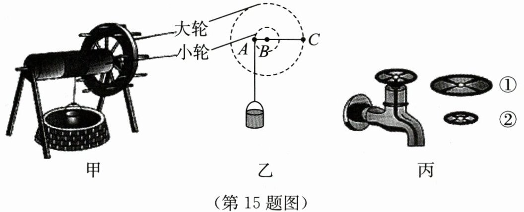 15. 明代宋应星在《天工开物》中记载的农业生产汲水装置——辘轳,沿用至今.如图甲所示是一种辘轳,由具有共同转动轴的大轮和小轮组成.提水时,用力使大轮转动,小轮随之转动并缠绕井绳,提起水桶.