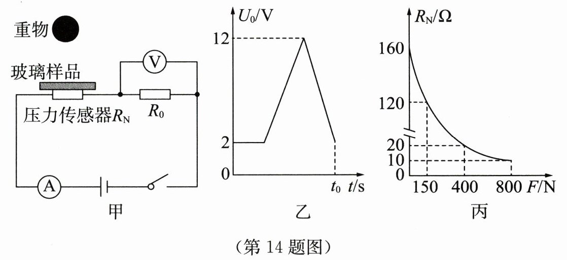 14. 物理实践小组为玻璃厂设计了一款用于测试玻璃能承受最大压力的电路.测试时,取一块玻璃样品,平放在如图甲所示电路中的压力传感器$R_{N}$上,闭合开关,在某一高度静止释放重物,撞击玻璃,玻璃完好如初,在此过程中记录电压表的示数随时间变化的图像如图乙所示(不考虑$t_{0}$时刻之后的情况).已知电源电压$U= 18V$,压力传感器的阻值$R_{N}$随压力F变化的关系如图丙所示.
