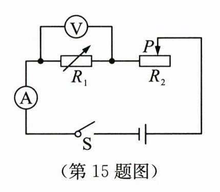 15. 用如图所示的电路研究通过导体的电流与电压、电阻的关系.保持电源电压和电阻箱$R_{1}$的阻值不变,移动滑动变阻器$R_{2}$的滑片P,测得电流、电压如表一所示;然后将滑片移到适当位置保持不变,仅改变电阻箱$R_{1}$的阻值,测得相应的电流值,如表二所示.