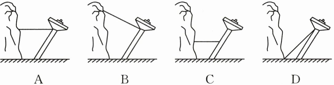 5. 地震使一个结构坚固的水塔因地基松软而倾斜,为阻止水塔继续倾斜,救援队借助山石用钢缆拉住水塔.下列方案中,钢缆对水塔拉力最小的是(