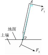 (2)植树时需要挖树坑,小军把铁锹的锹面踩进坚硬的土壤里,用锹把土翻起,如图乙所示的是铁锹的剖面图,土壤对锹面的阻力$F_{2}$的示意图已画出,请在图中找到并标出支点O,画出最小作用力$F_{1}$的示意图及其力臂$l_{1}$。