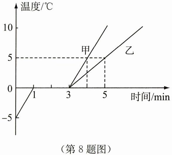 8. 小叶同学用酒精灯对冰块加热,研究冰的熔化现象.如图所示,甲、乙两条图线中的一条是他依据实验数据绘制而成的.已知$m_{冰}= 0.1\ kg$,$c_{水}= 4.2× 10^{3}\ J/(kg·^{\circ}C)$,$c_{冰}= 2.1× 10^{3}\ J/(kg·^{\circ}C)$.下列分析中正确的是(