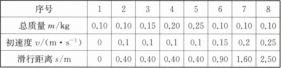 |滑行距离s/m|0|0.40|0.40|0.40|0.40|0.90|1.60|2.50|