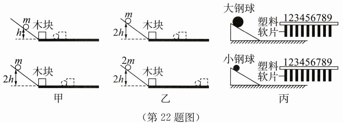 22. (8分)为了探究影响动能大小的因素,老师设计了如图甲、乙所示的实验方案.