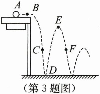 3. 如图所示,从A点沿水平桌面自由滚落的小球运动轨迹如虚线所示,C、F两处等高,D为球与水平地面的接触点,不计空气阻力.下列说法不正确的是(