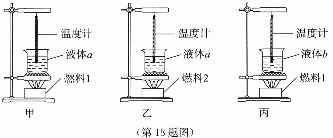 18. (7分)如图所示,甲、乙、丙三图中的装置完全相同.燃料的质量都是10 g,烧杯内的液体质量、初始温度都相同,当燃料燃烧完时(烧杯内的液体均未沸腾),立即读取相应温度计的读数,分别为T甲、T乙和T丙,且有T甲>T乙>T丙.